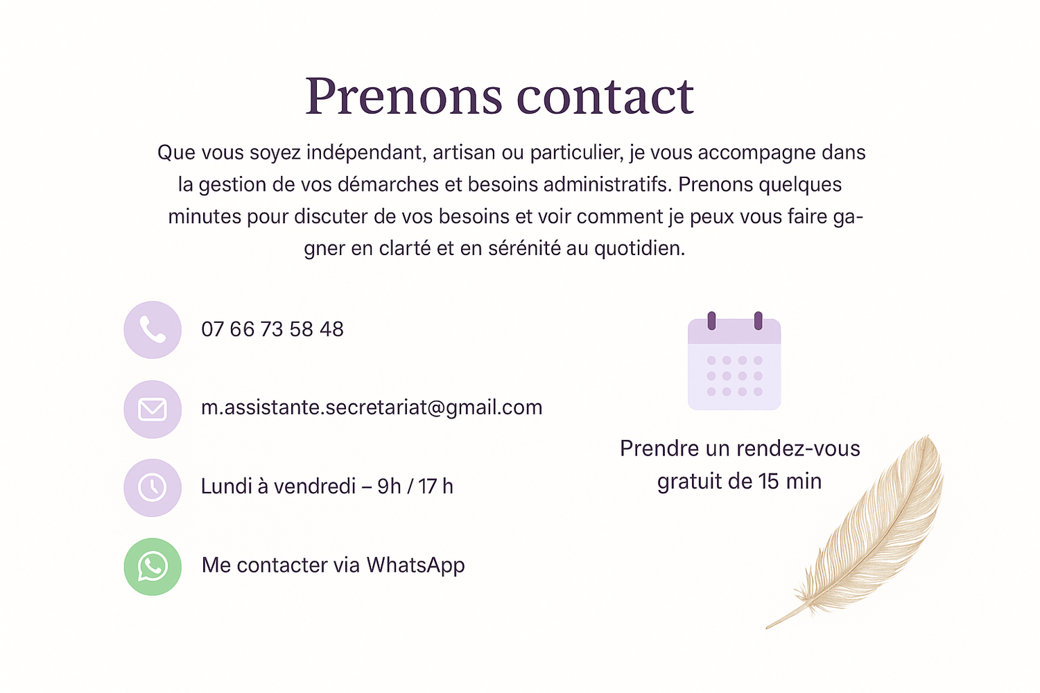 Assistante indépendante spécialisée en gestion administrative pour entrepreneurs, artisans, professionnels de santé et particuliers.